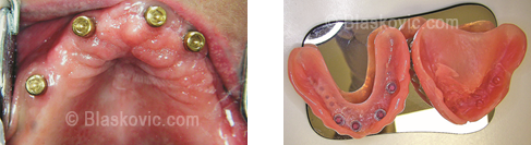 Često totalne proteze, osobito donja, nisu stabilne u ustima. Pomične su, otežavaju žvakanje i govor. Ugradnjom samo 2 do 4 implantata proteza se može znatno učvrstiti te olakšati nošenje i žvakanje. U gornjoj čeljusti, pored navedenog, proteza nad implantatima izrađuje se reducirano, s otvorenim nepcem.